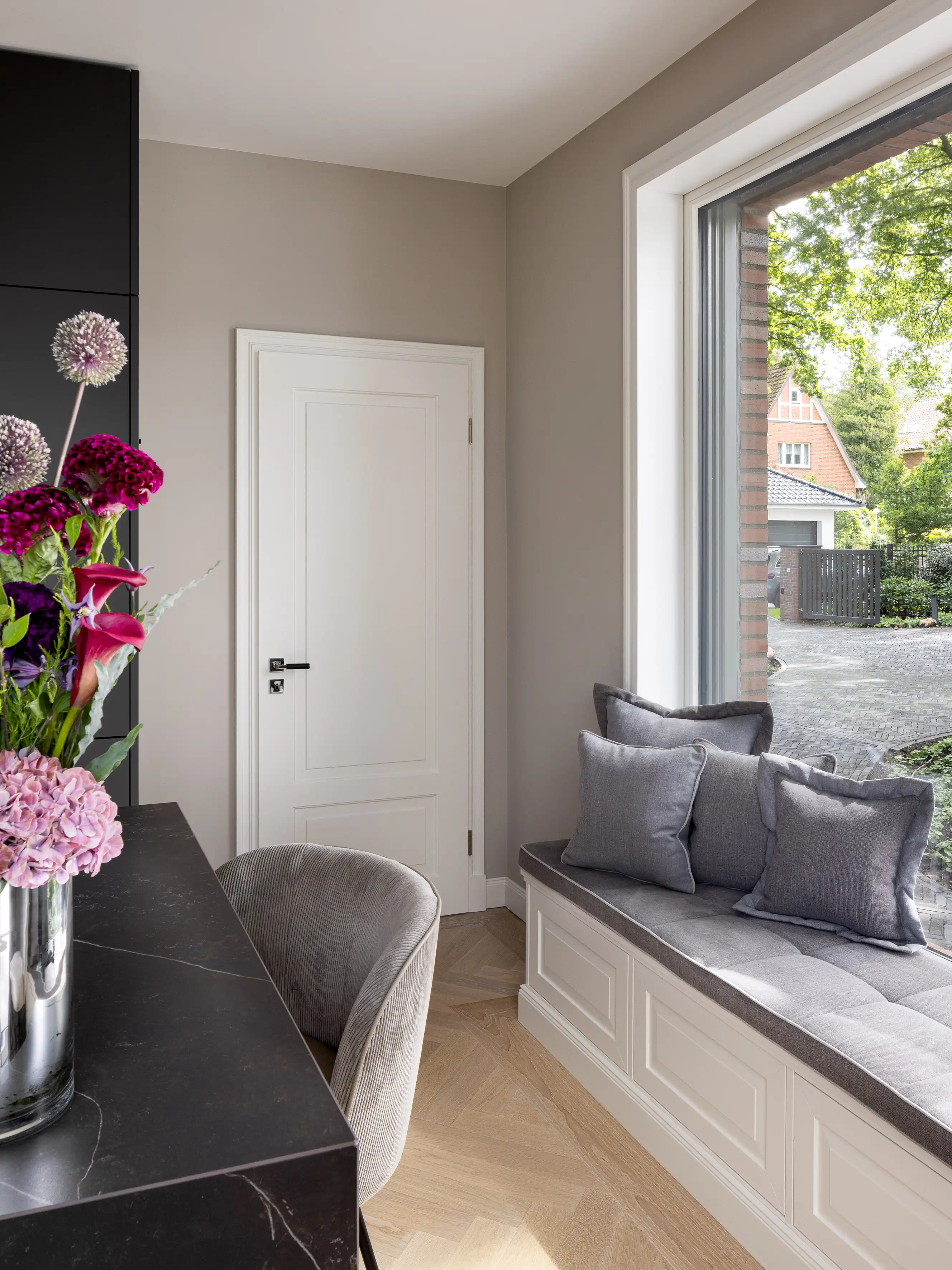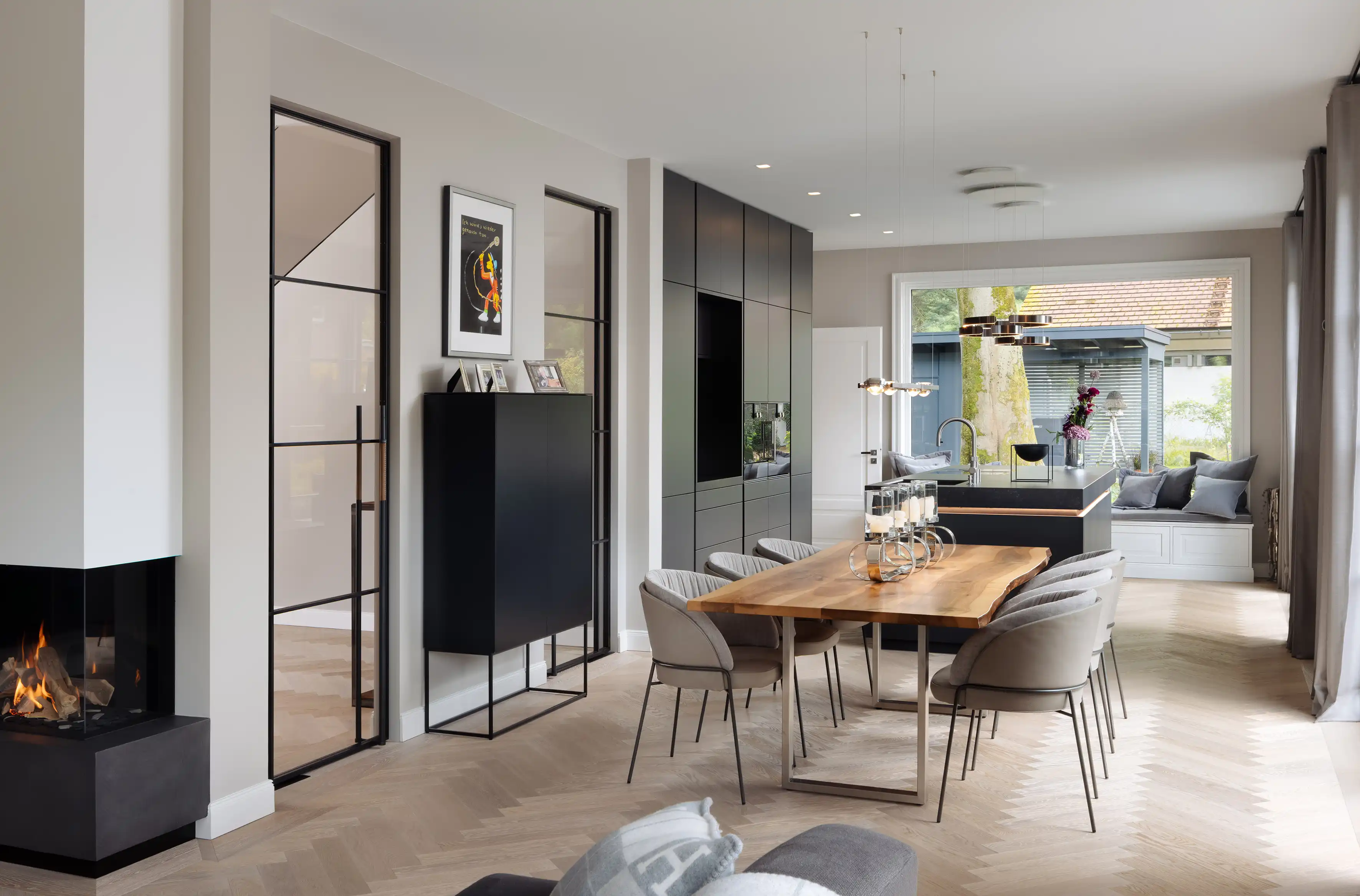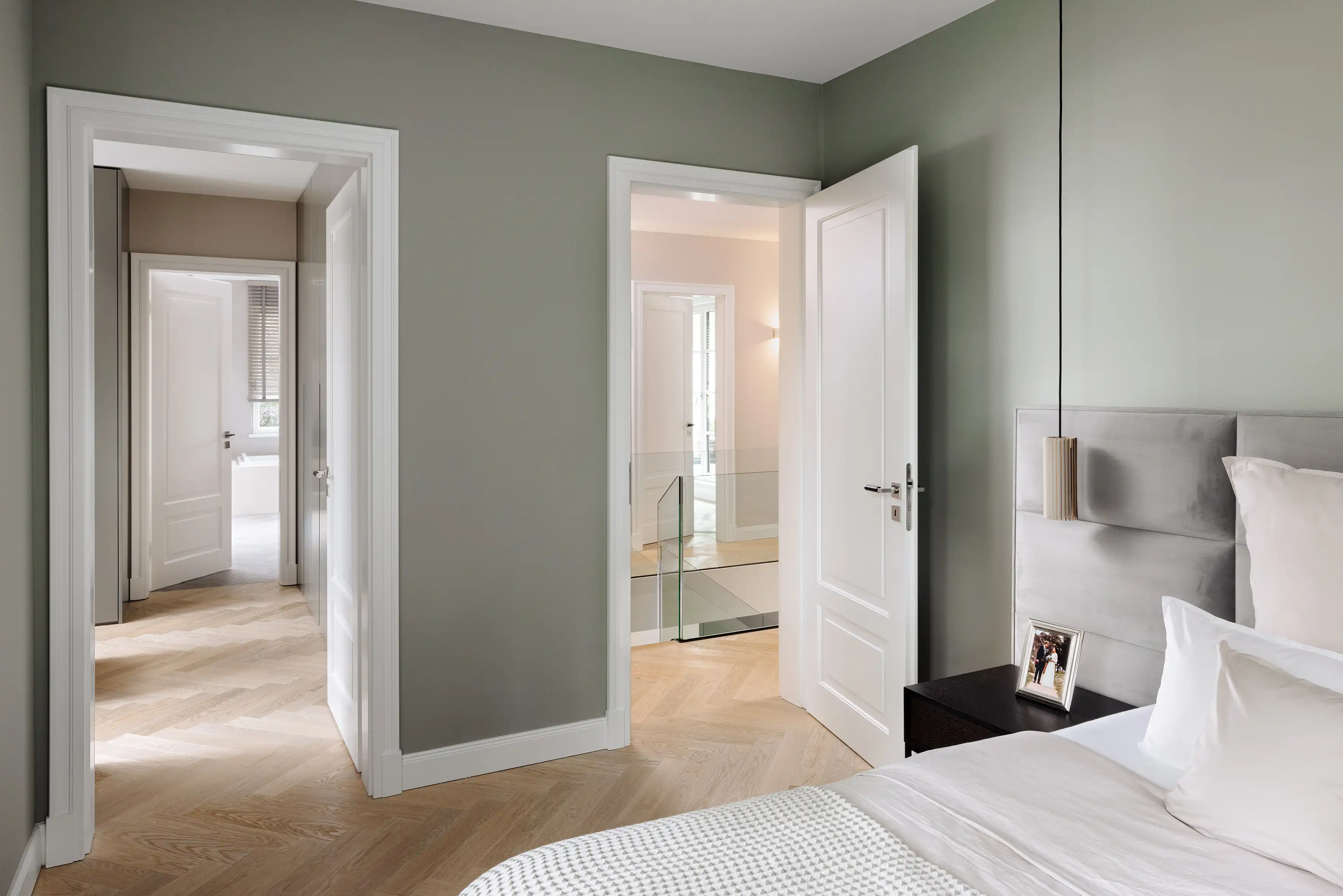 Dieses beeindruckende Privathaus, eingebettet in ein weitläufiges Grundstück, wurde von Grund auf saniert und mit viel Gespür für hochwertige Inneneinrichtung neu gestaltet. Die großzügigen Raumaufteilungen spielen gekonnt mit Licht und Weite. Entstanden ist ein luftiges, helles Ambiente, das unsere Denkmalschutz- und Villentüren mit einer beeindruckenden Höhe von 2,90 m perfekt ergänzen. Sehr schön zu sehen sind hier die gestalterischen Möglichkeiten, die die unterschiedlichen Modellvarianten von doppelflügliger Tür vs. einflüglig über geschlossen vs. mit Lichtausschnitten bis hin zur Schiebetür mit sich bringen.