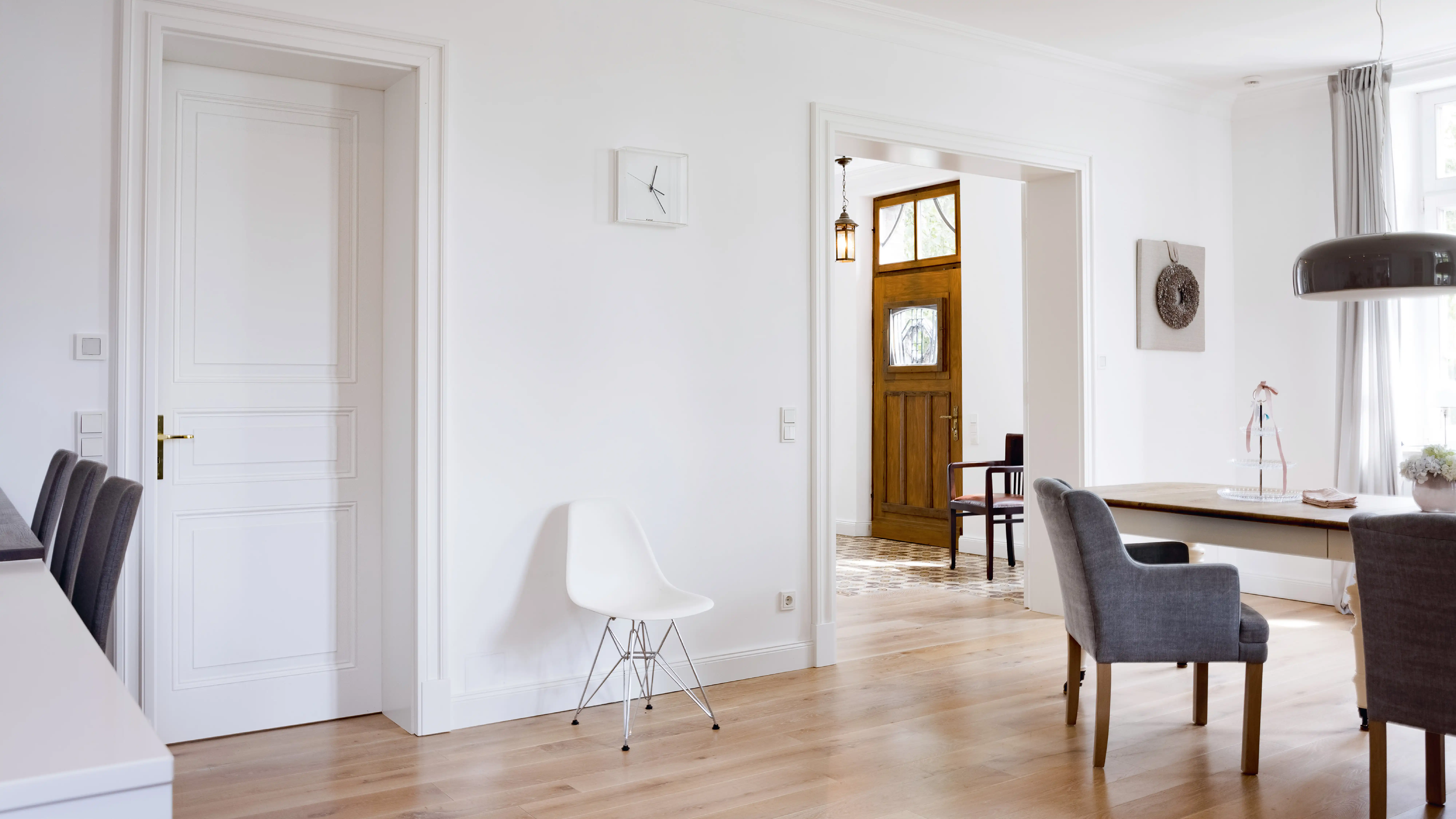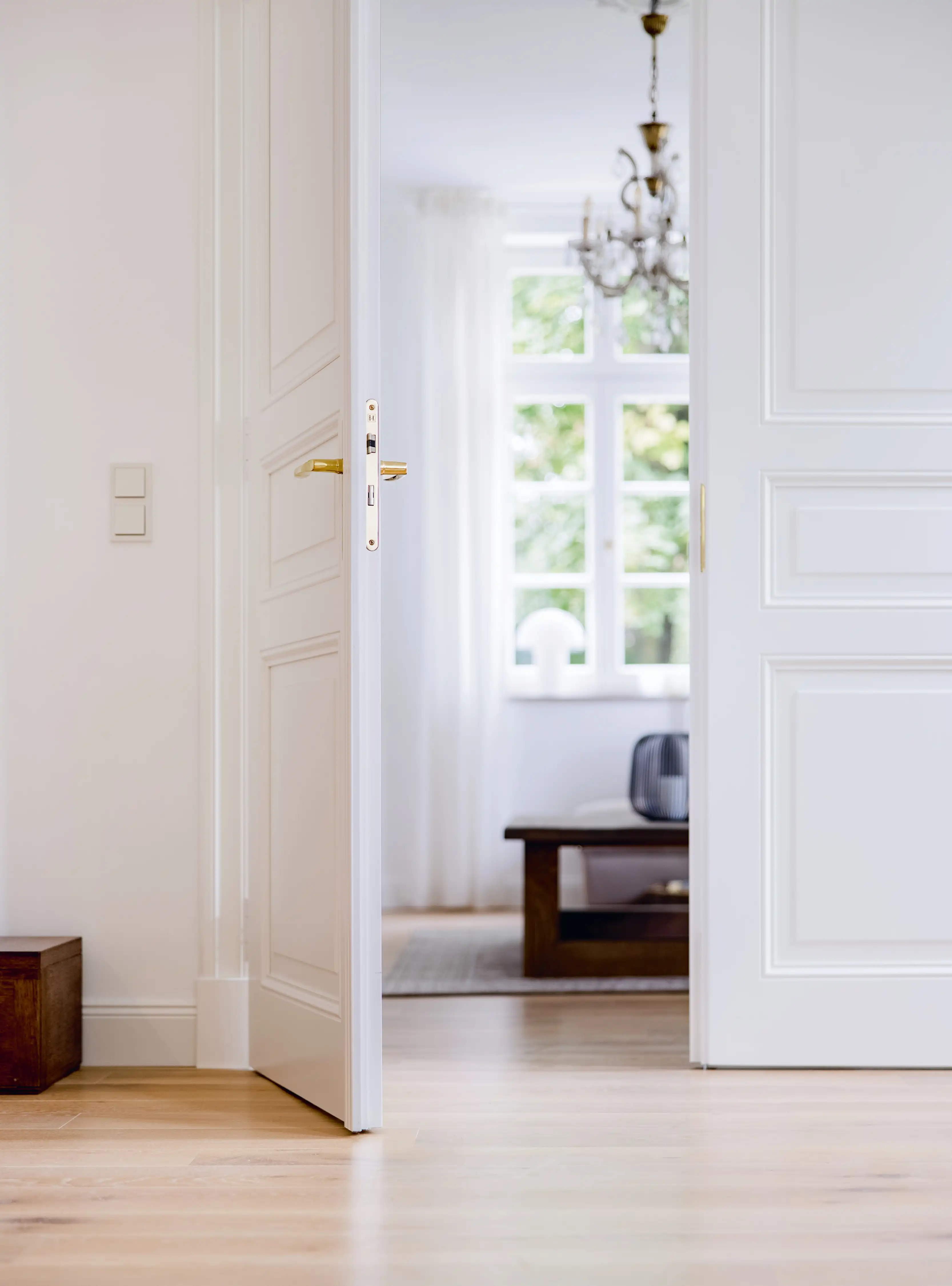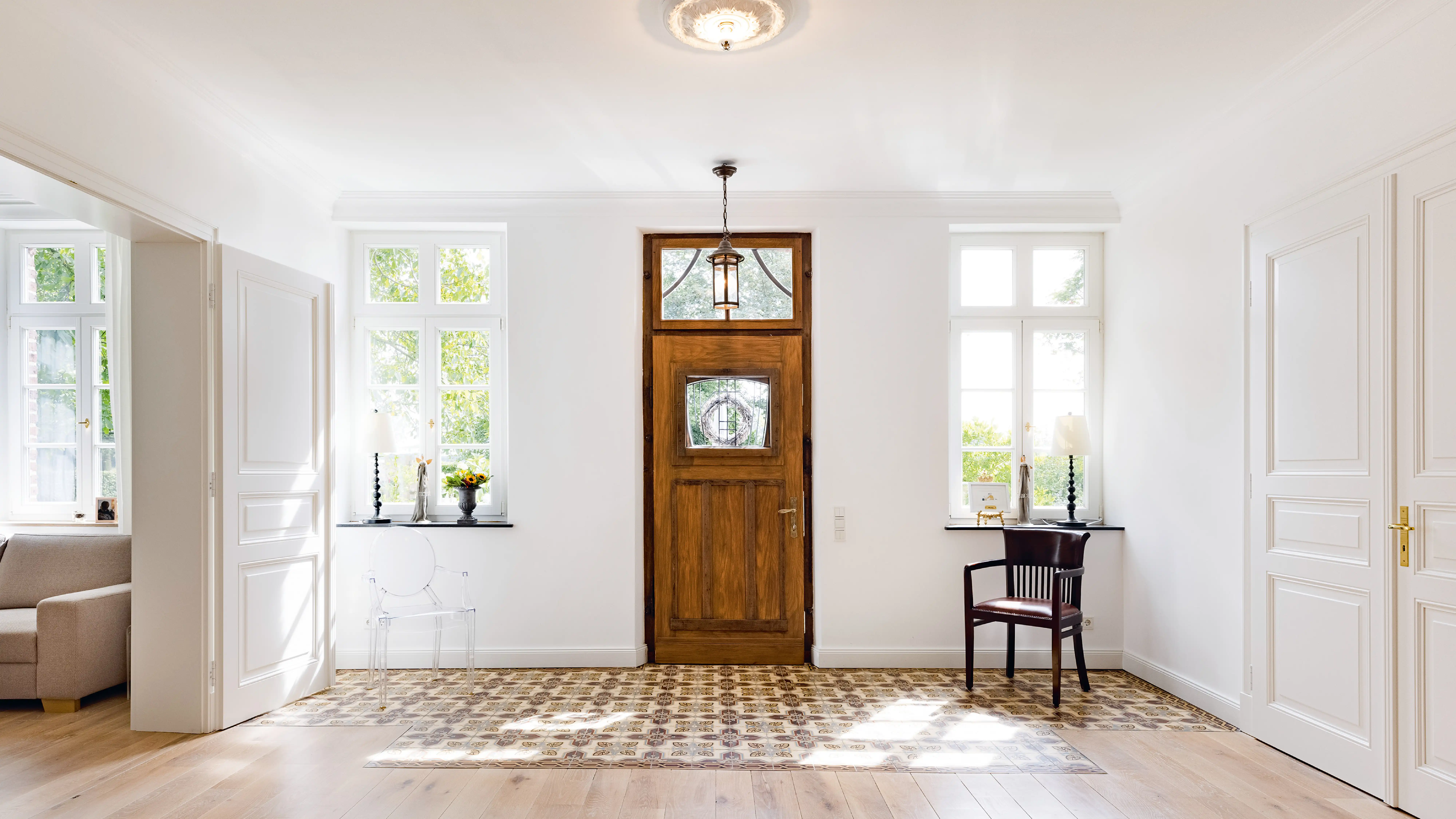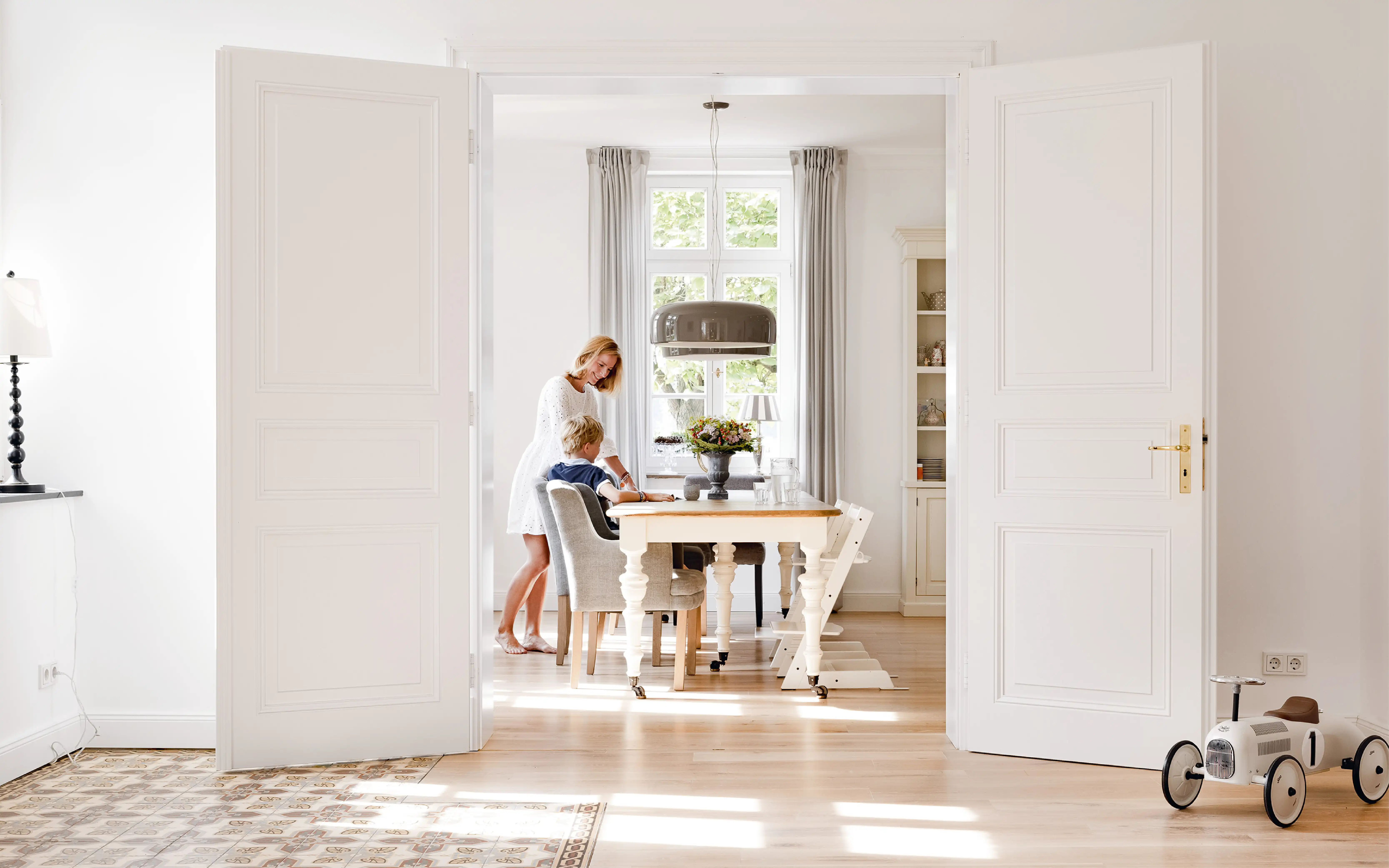 Dieses beeindruckende Privathaus, eingebettet in ein weitläufiges Grundstück, wurde von Grund auf saniert und mit viel Gespür für hochwertige Inneneinrichtung neu gestaltet. Die großzügigen Raumaufteilungen spielen gekonnt mit Licht und Weite. Entstanden ist ein luftiges, helles Ambiente, das unsere Denkmalschutz- und Villentüren mit einer beeindruckenden Höhe von 2,90 m perfekt ergänzen. Sehr schön zu sehen sind hier die gestalterischen Möglichkeiten, die die unterschiedlichen Modellvarianten von doppelflügliger Tür vs. einflüglig über geschlossen vs. mit Lichtausschnitten bis hin zur Schiebetür mit sich bringen.