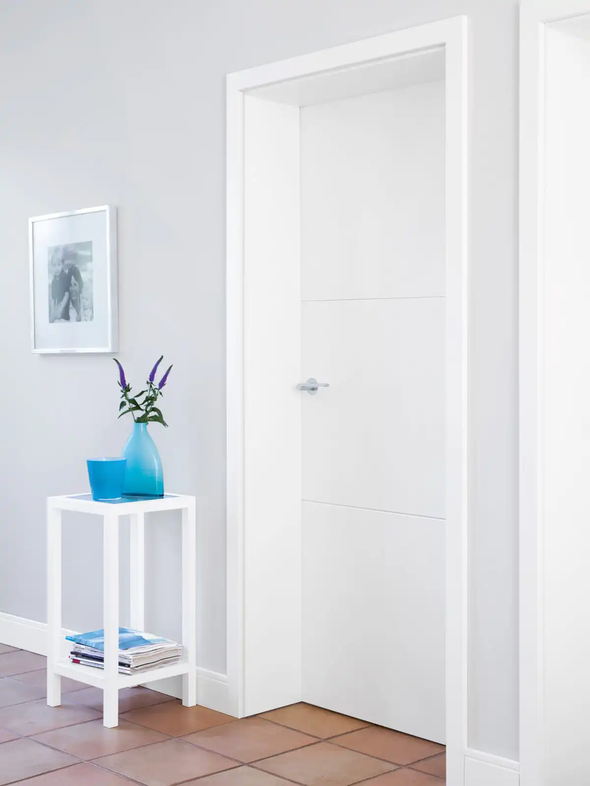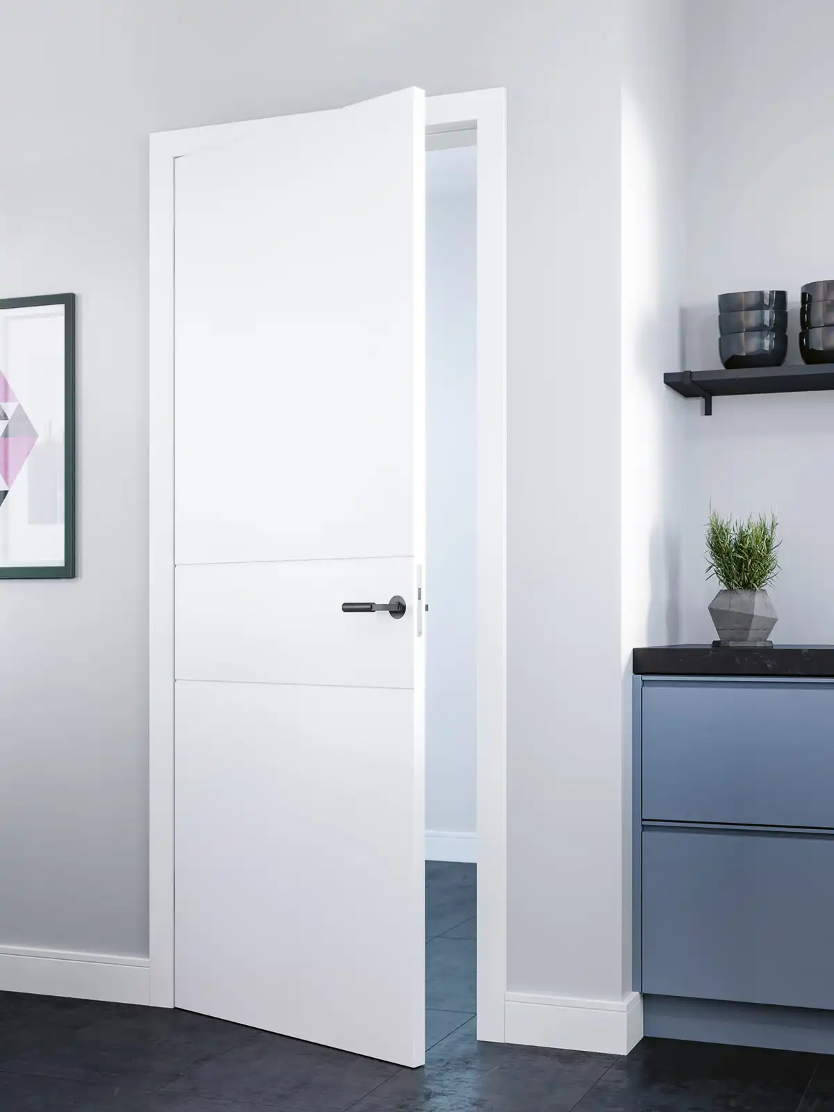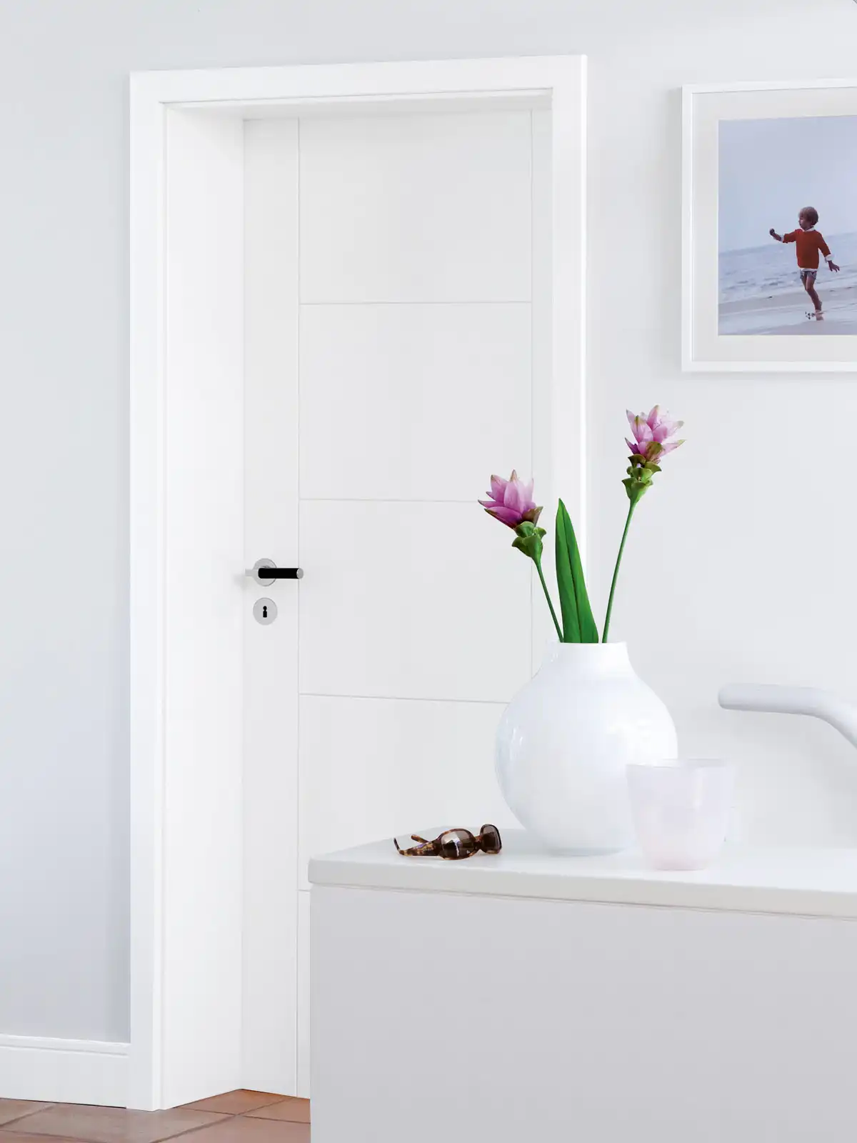 Diese moderne Designtür läßt zahlreiche Einrichtungsstile zu. Bei den gefrästen Linien mit klaren Konturen, können Sie zwischen einer V-Fuge und einer Trapezfräsung wählen. Sie geben der Tür Ausdruck, aber keine Gestaltungsrichtlinien vor.
