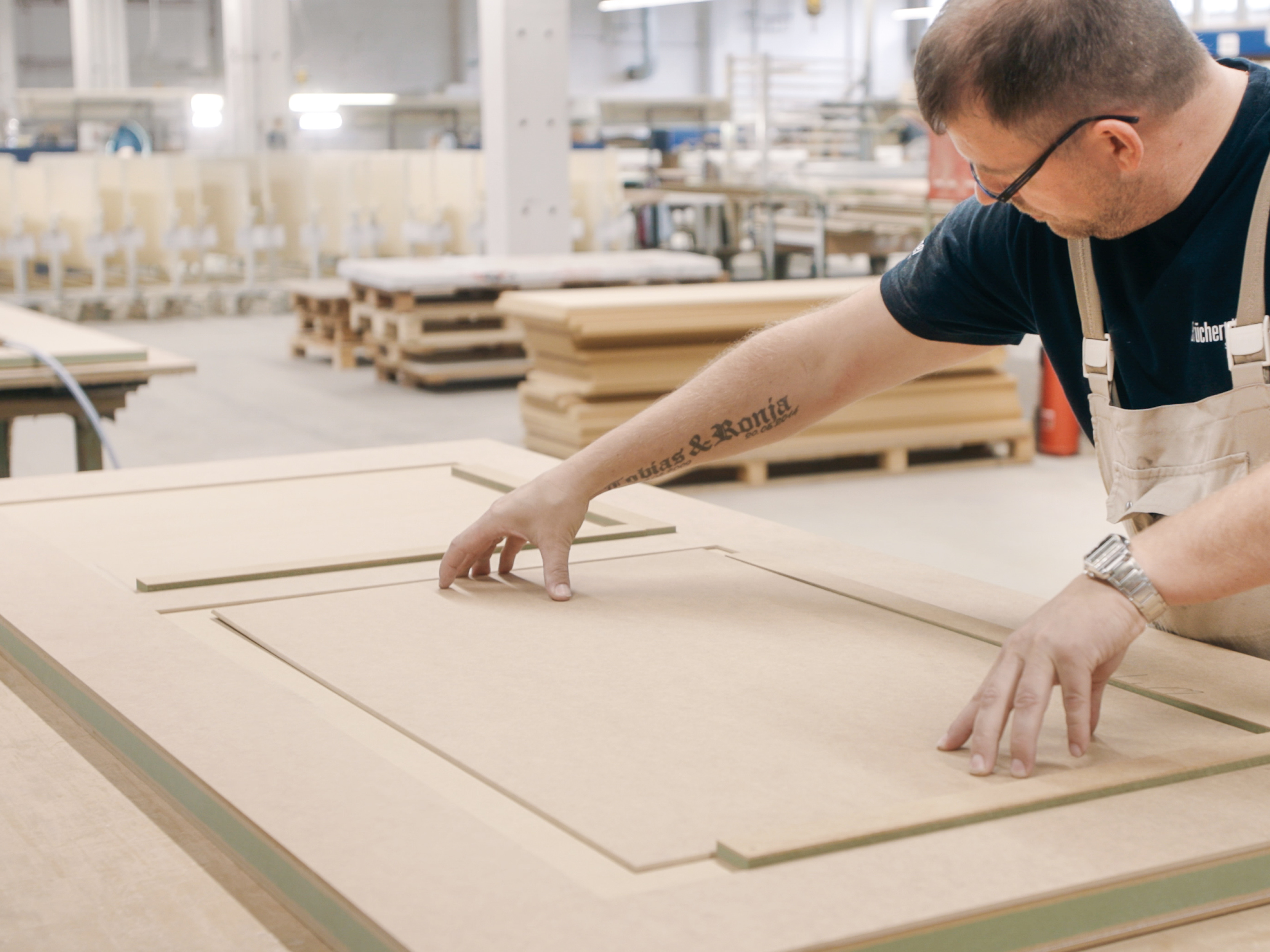 Als Basis für unsere Türblätter verwenden wir MDF. Dieser Holzwerkstoff, hauptsächlich hergestellt aus fein zerfasertem Nadelholz, bringt ideale Bedingungen für den Bau unserer Türen. Das massive Material erlaubt das Fräsen aufwändiger Profilierungen und gibt der Tür ein Plus an Schallschutz.