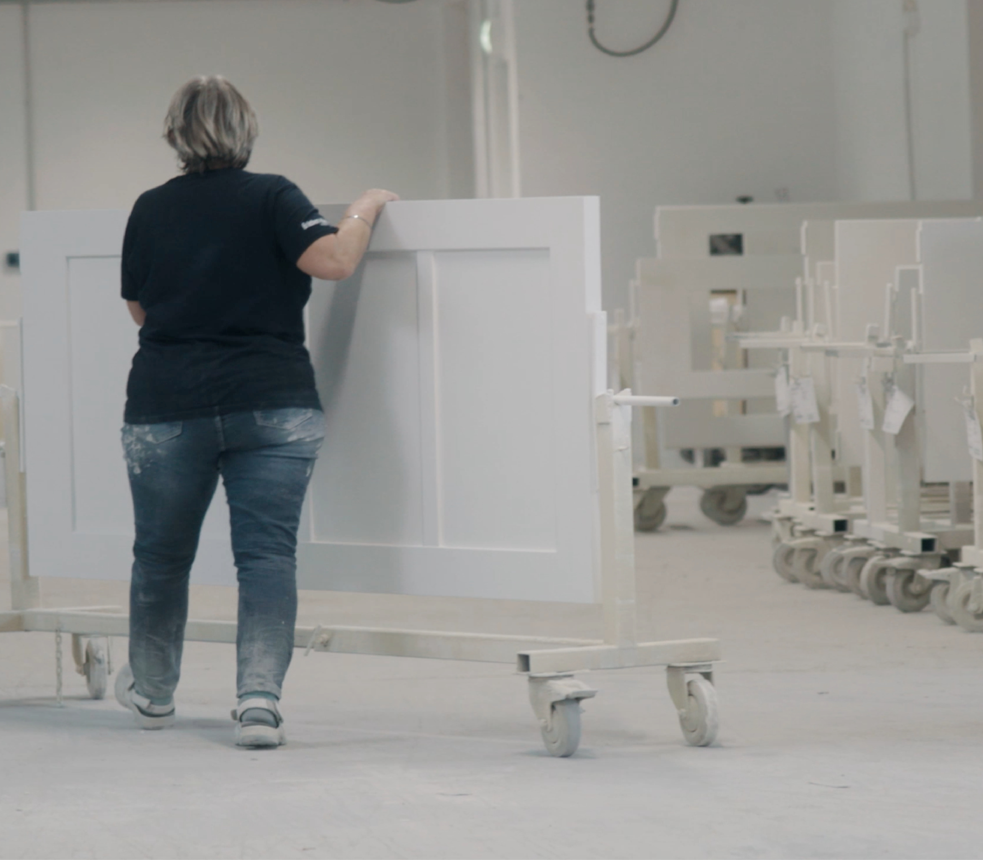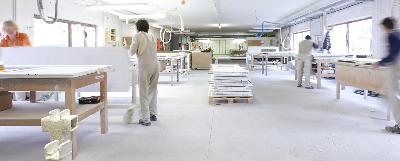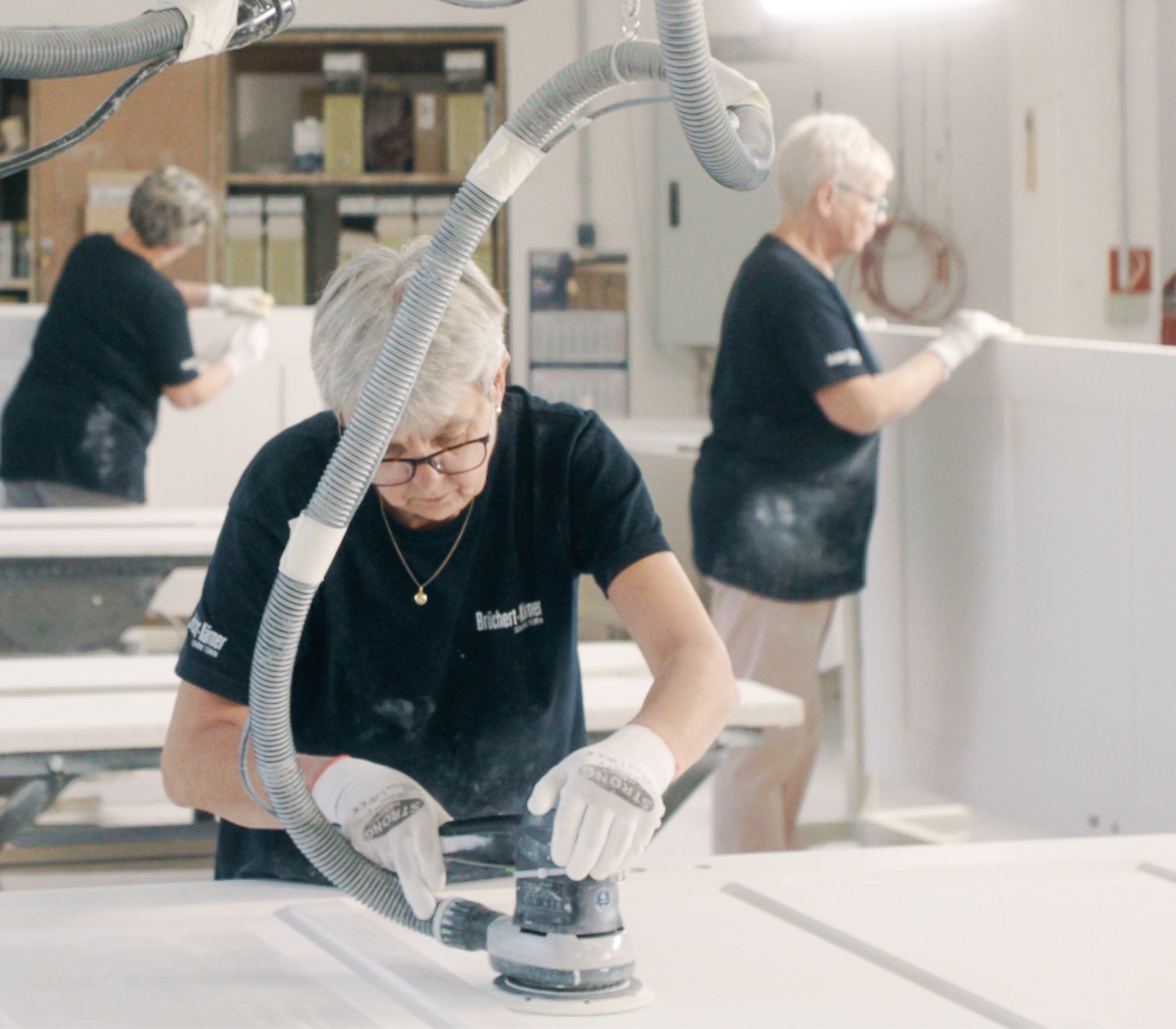 Die mehrmaligen Arbeitsgänge des Schleifens und Lackierens, die mit der Hand ausgeführt werden, führen zu einer edlen, wohnlichen Oberfläche. Den Umweltanforderungen entsprechend verwenden wir wasserbasierte Lacksysteme. Weiß, ähnlich RAL 9010 oder das »weißere« RAL 9016 sind unser Standard. Als Sonderfarben steht Ihnen nahezu die ganze Palette der RAL und NCS-Töne zur Verfügung – sehr edel in der neuen »Softmatt-Lackierung«.