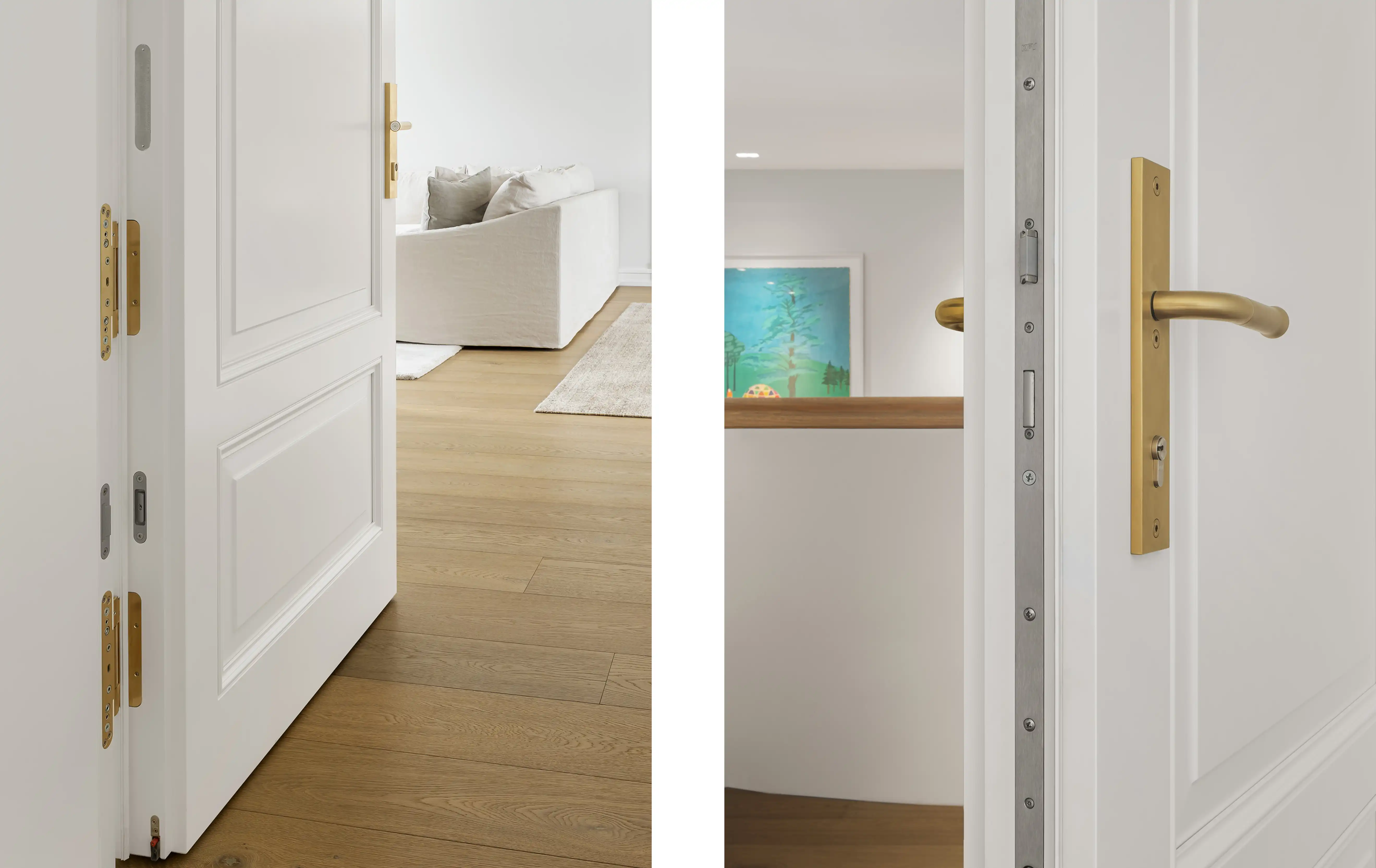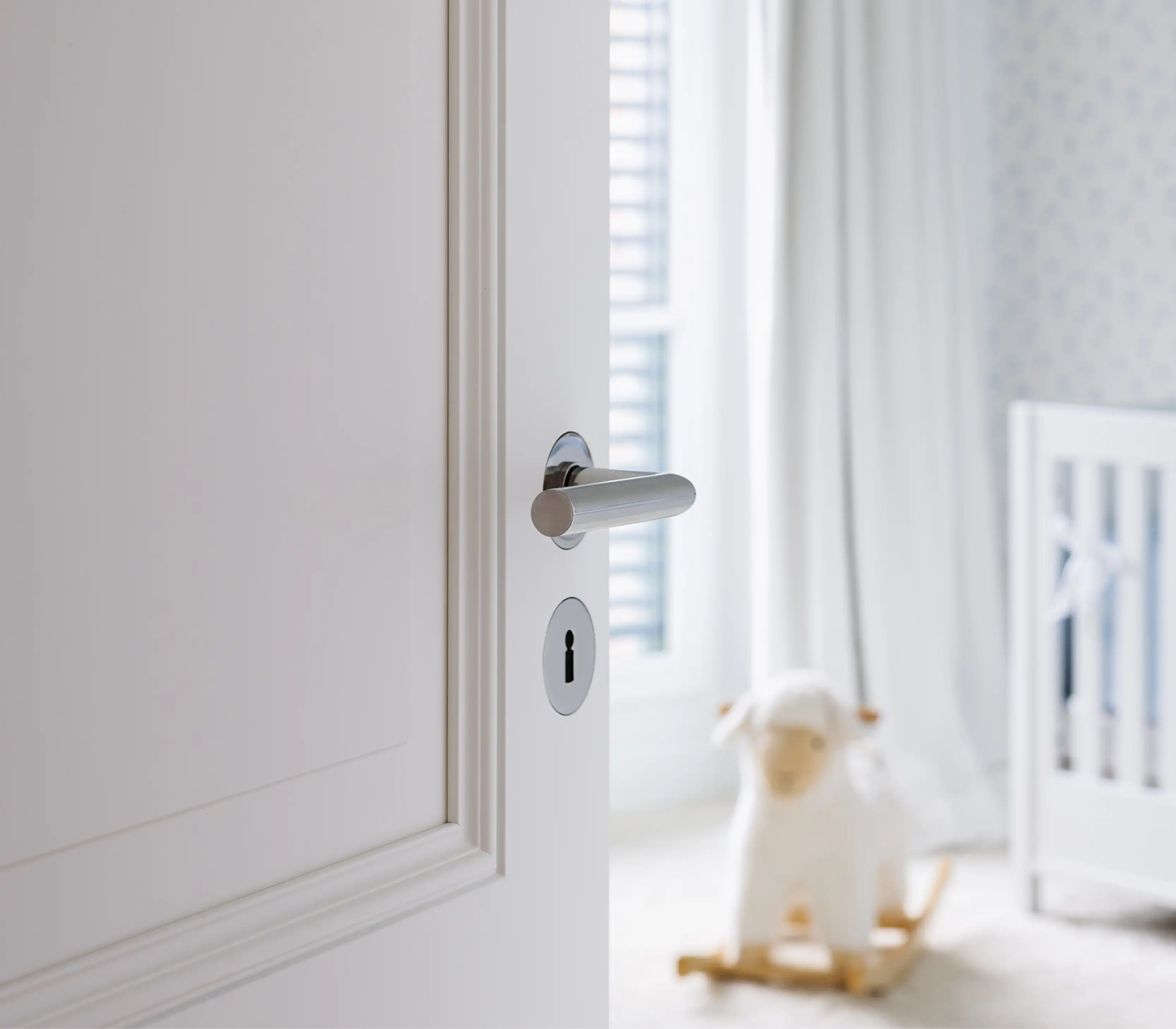 Zu unserem Standard gehören 3-teilige Bänder und ein Flüstercomfortschloss. Optional bieten wir Magnetschlösser, verdeckte Bänder und edle Türdrücker an. Auf Wunsch erhalten Sie flächenbündig eingelassene Drückerrosetten in rund, eckig oder als Langschild.